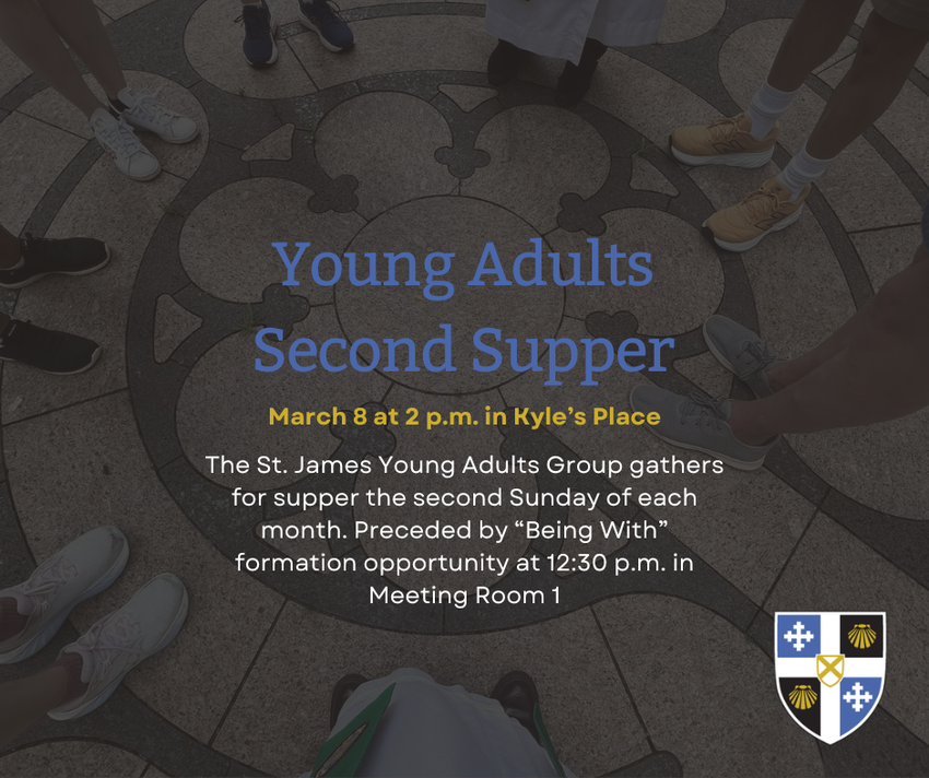 The St. James Young Adults group will gather for Second Supper on Sunday, March 8 at 2 p.m. in Kyle’s Place. Preceded by “Being With” formation opportunity at 12:30 p.m. in Meeting Room 1 (lower level of modern building).